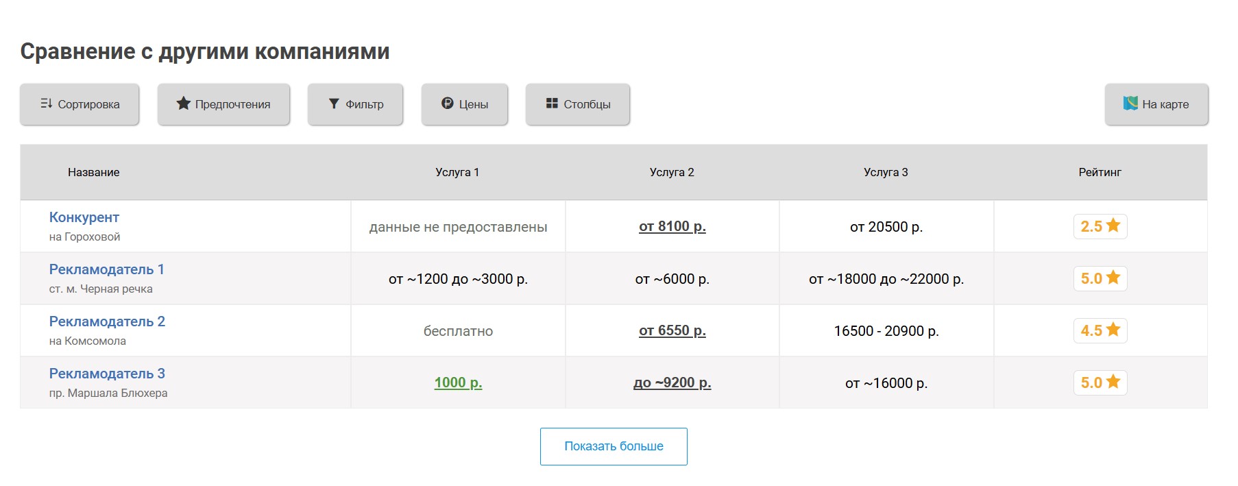 Если компания имеет конкурентные преимущества, мы можем их опубликовать на странице квеста и показывать в таблицах в соответствующих страницах. Преимущества можно гибко настраивать для разных услуг. Правильная публикация преимуществ существенно увеличивает интерес посетителей, так как выделяет квест в таблицах и показывает, почему следует обратиться именно туда.